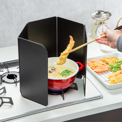 | 商品特徴 | 使う時だけ取り出して、コンロ回りを油汚れからガード。料理からの汁トビ、油ハネを囲んでガードできます。 高さのある5枚パネルだから調理器具に合わせて設置でき使い方も色々。 フッ素加工でお手入れも簡単です。システムキッチンのIH・ガスどちらでも使用できます。 スチール製だから、熱に強く、耐久性もばっちり。折りたためてコンパクトに収納できます。 |