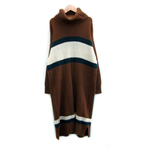 【中古】レイカズン ニットワンピース 長袖 ミモレ丈 タートルネック ボーダー柄 F マルチカラー ブラウン レディース