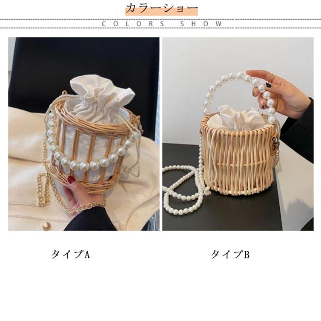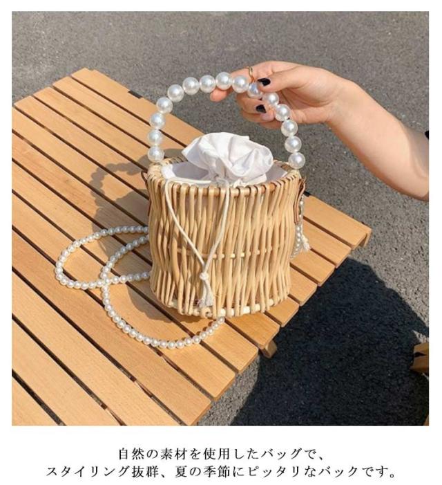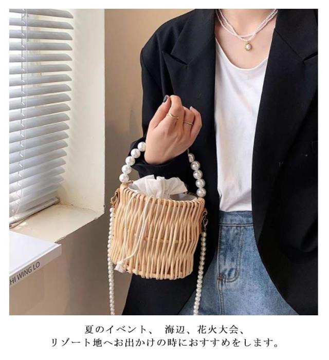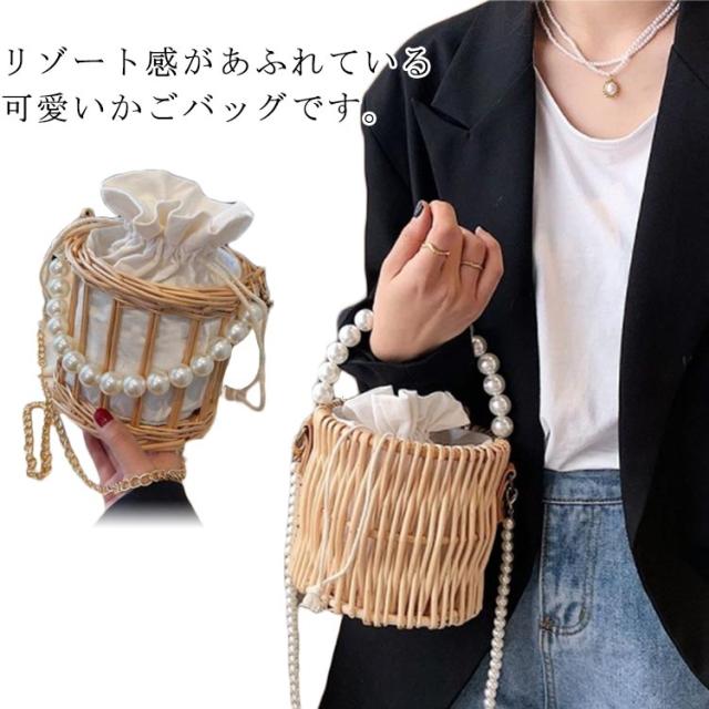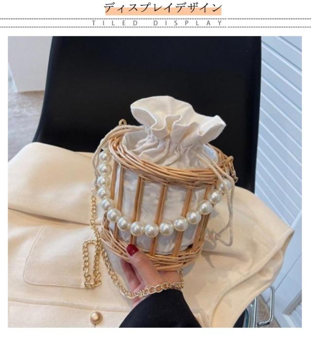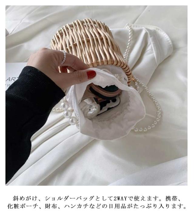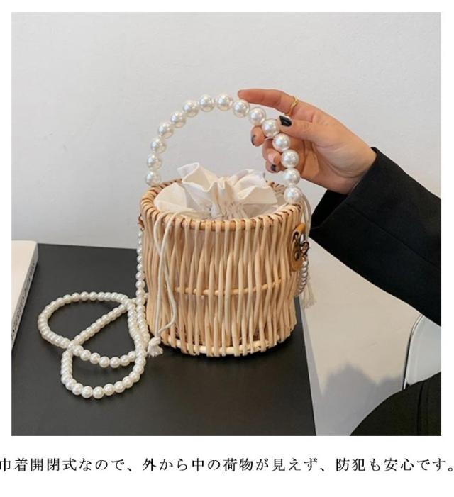 かごバッグ 巾着 浴衣 ショルダー パール取っ手 レディース 白 2way カバン 斜め掛け 大容量 大人かわいい 籐バッグ バスケットバッグ かご編みバッグ 手提げ ストローバッグ トートバッグ 袋付き ナチュラル