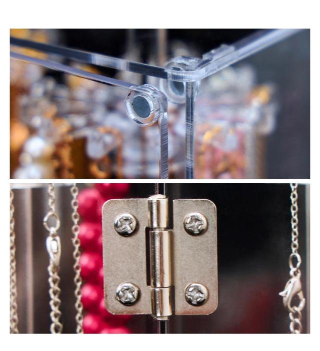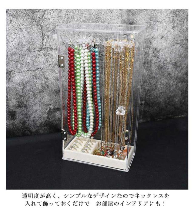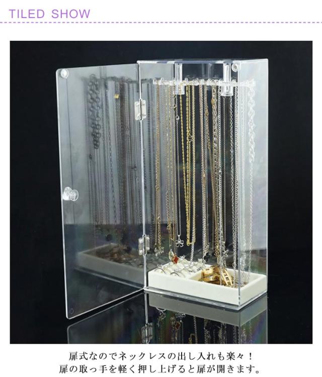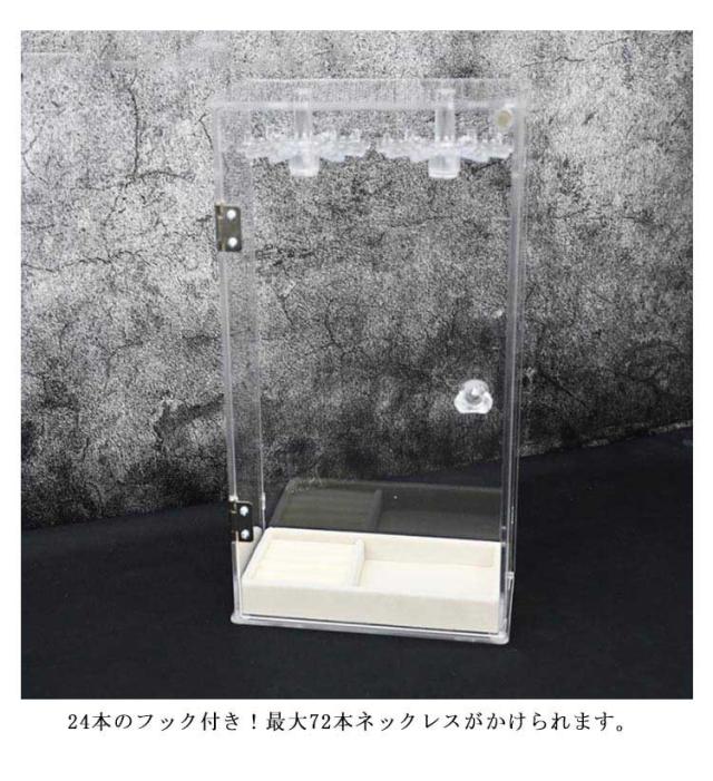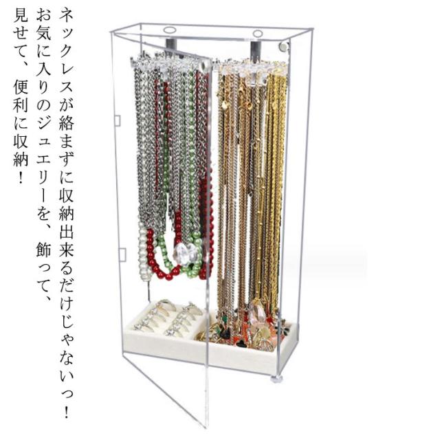 | ネックレスが絡まずに収納出来るだけじゃないっ!お気に入りのジュエリーを、飾って、見せて、便利に収納! 扉式なのでネックレスの出し入れも楽々!扉の取っ手を軽く押し上げると扉が開きます。 フックは回転するので、奥に吊るしたものも取り出しやすくなってます! (底部)収納ケースもついているので、ネックレス以外にもリングやブレスレットなどの小物もまとめて収納できるのが嬉しいですね♪ 素材は無色・高透明度のアクリル製なので、アクセサリーを見せながら収納できインテリアとして最適です。 透明度が高く、シンプルなデザインなのでネックレスを入れて飾っておくだけで お部屋のインテリアにも! 24本のフック付き!最大72本ネックレスがかけられます。 | |