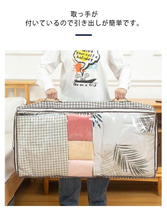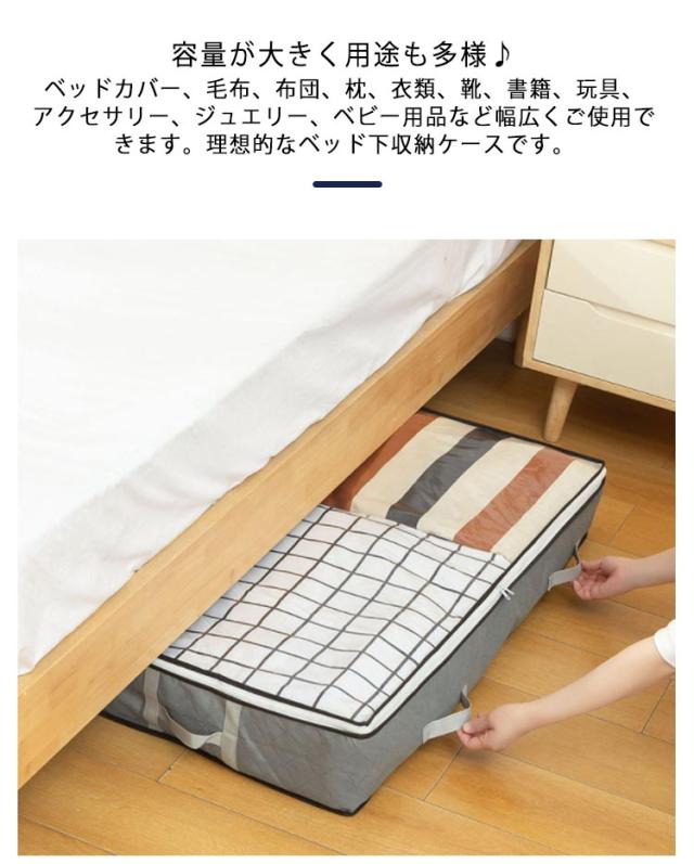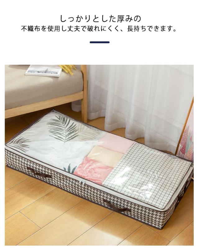 | ベッド下のスペース有効活用♪特大収納ケース。 中身が確認しやすい上部透明仕様、中身が一目でわかるので、開けて探す手間も省けます。 取っ手が付いているので引き出しが簡単です。 容量が大きく用途も多様♪ベッドカバー、毛布、布団、枕、衣類、靴、書籍、玩具、アクセサリー、ジュエリー、ベビー用品など幅広くご使用できます。理想的なベッド下収納ケースです。 しっかりとした厚みの不織布を使用し丈夫で破れにくく、長持ちできます。 | |