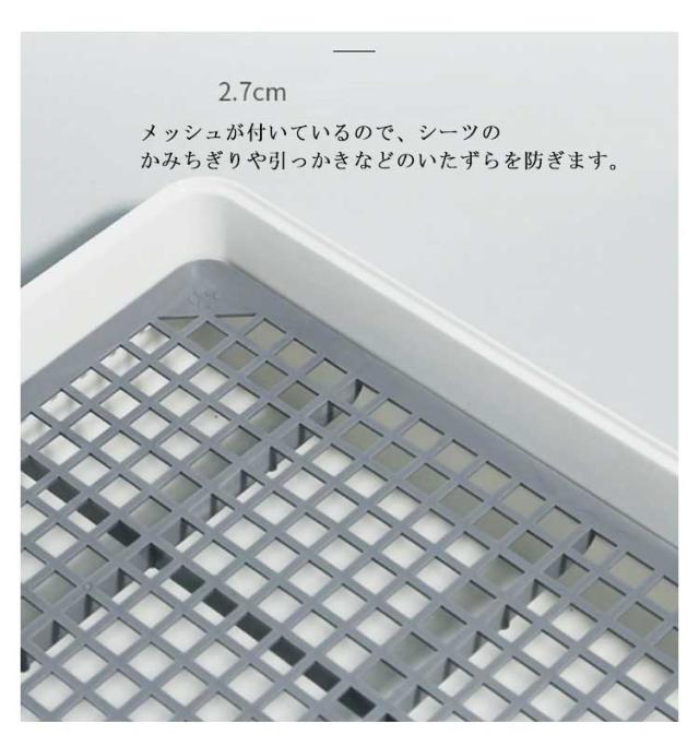 | ゆとりのある大きさで、トイレの失敗・お悩みを解決!犬用トイレ。 プラスチック製なので、水洗いできてお手入れ簡単です。 メッシュが付いているので、シーツのかみちぎりや引っかきなどのいたずらを防ぎます。 メッシュは取付できるので、お掃除もラクラク。 オシッコが流れやすく、汚れが溜まりにくい形状です。 安全のPP素材、無害無臭。 | |