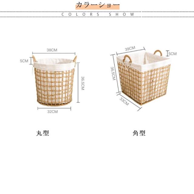 | サイズについての説明 | 角型:幅33cm 奥行39cm 高さ36.5cm 持ち手長さ5cm 丸型:底径32cm 口径38cm 高さ36.5cm 持ち手長さ5cm |