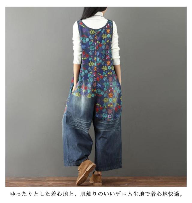 クラッシュ デニムパンツ デニムサロペット 送料無料 3段調整 サロペット ダメージ ワイドパンツ レディース 体型カバー サロペットパンツ つなぎパンツ デニム オールインワン プリント ナチュラル 可愛い