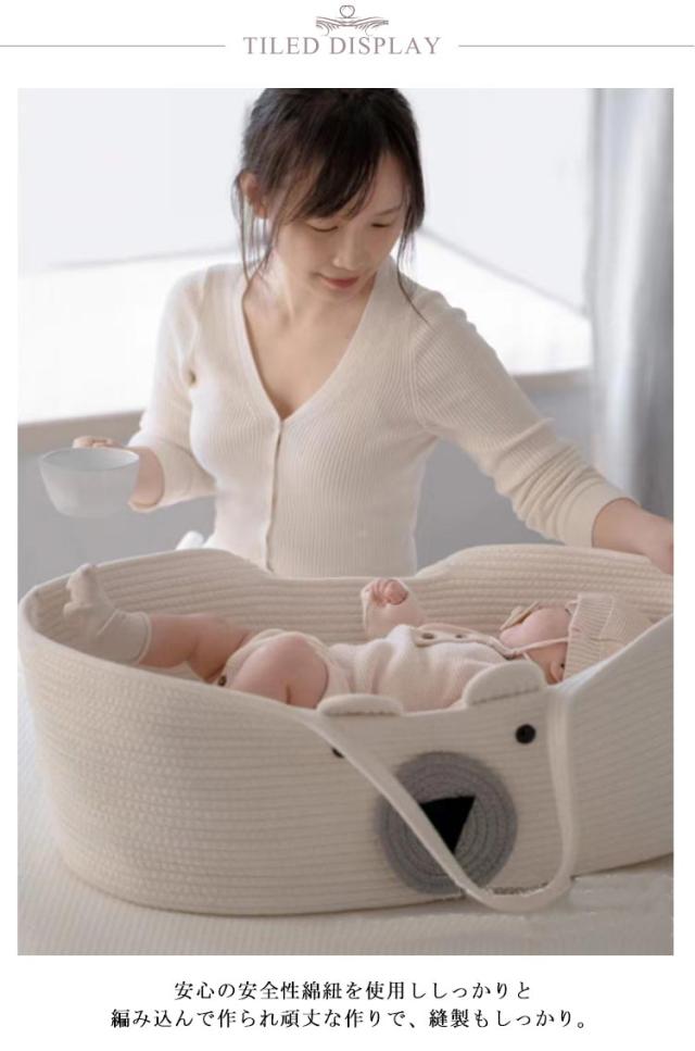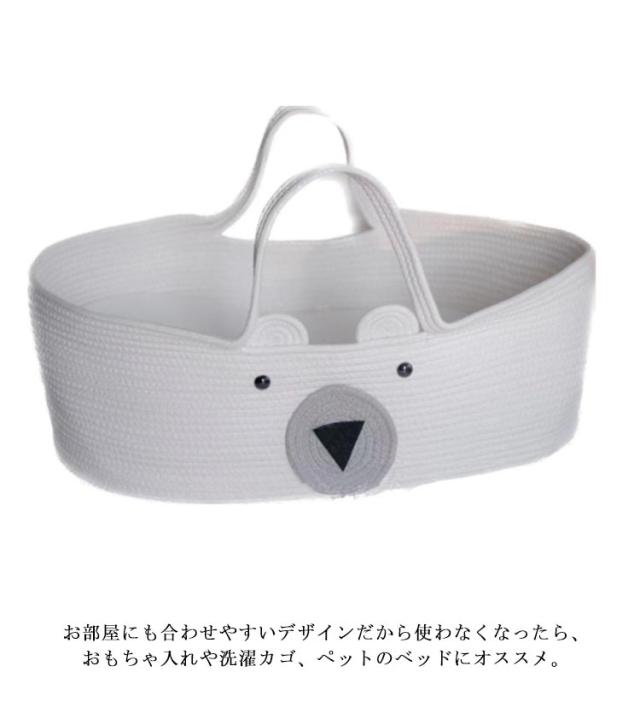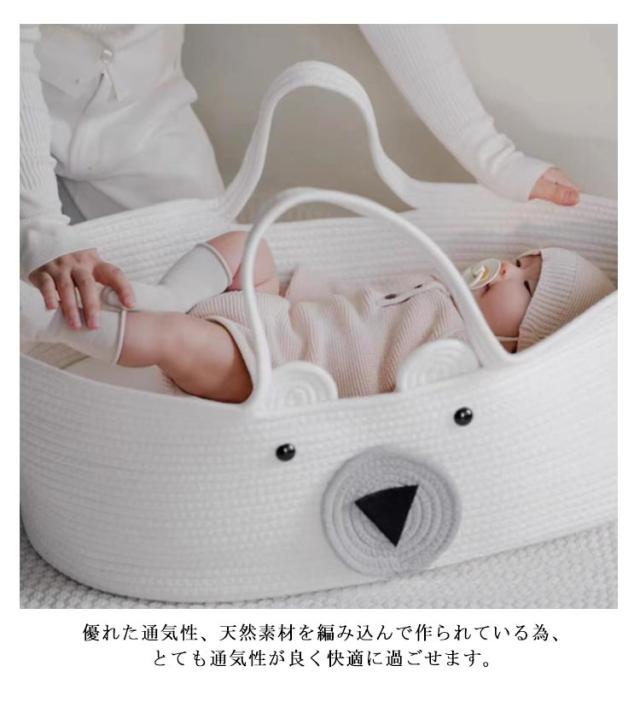 | おもちゃカゴやお洗濯カゴとしても使える赤ちゃんカゴ♪ 安心の安全性綿紐を使用ししっかりと編み込んで作られ頑丈な作りで、縫製もしっかり。 優れた通気性、天然素材を編み込んで作られている為、とても通気性が良く快適に過ごせます。 お部屋にも合わせやすいデザインだから使わなくなったら、おもちゃ入れや洗濯カゴ、ペットのベッドにオススメ。 | |