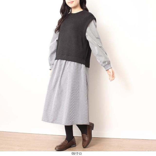 【L〜5L】【MB】ニットソー × シャツ ドッキングワンピース