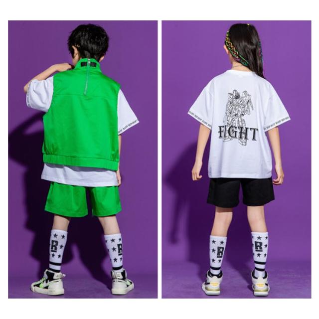 キッズ ダンス 衣装 セットアップ 3点セット パンツ ベスト tシャツ 半袖 グリーン 緑 ブラック 黒 カーゴパンツ hiphop ジャズダンス チアダンス ショートパンツ セットアップ 女の子 男の子 ジュニア 練習着 k-pop 衣装 かっこいい 演出服 応援団 ステージ衣装