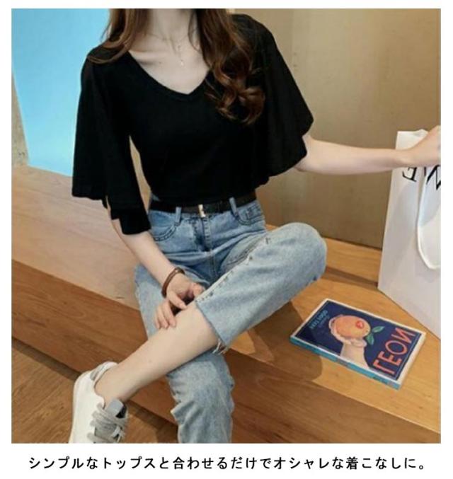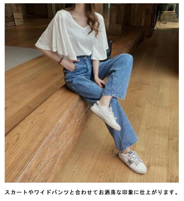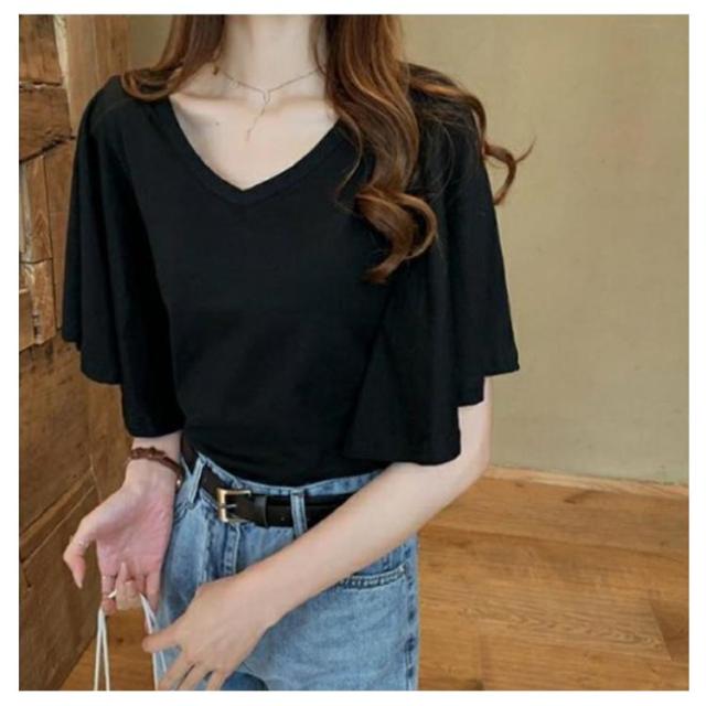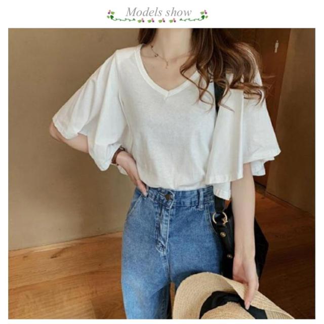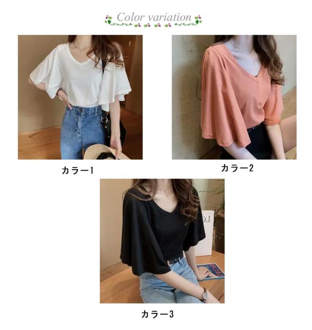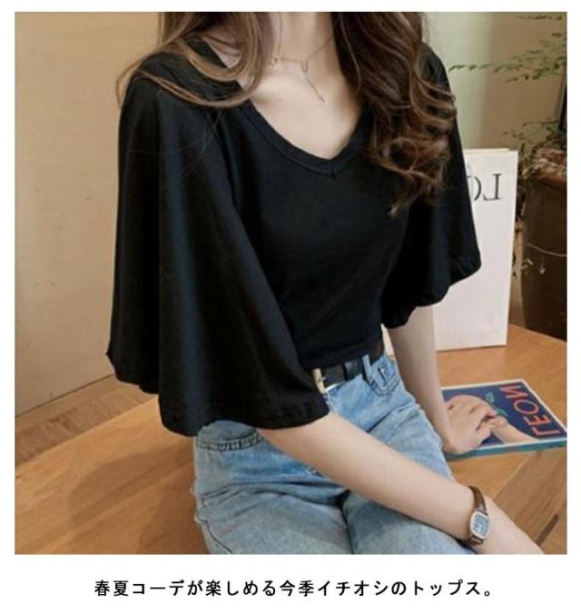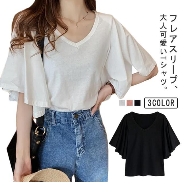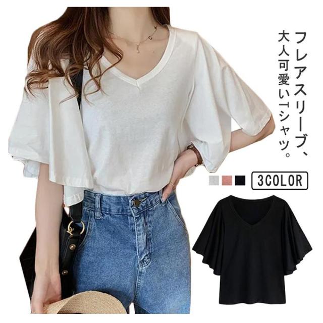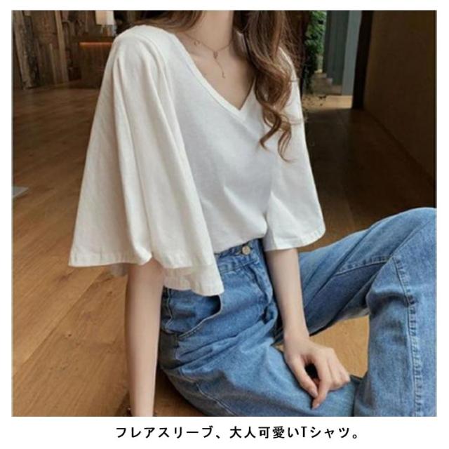 フレア スリーブ Tシャツ カットソー 半袖 5分袖 Tシャツ レディース 半袖Tシャツ 体型カバー ゆったり 大きいサイズ 韓国 通勤 無地 学生 通学 メロン カジュアル フレア袖 20代 30代 M L XL 2XL 3XL 4XL