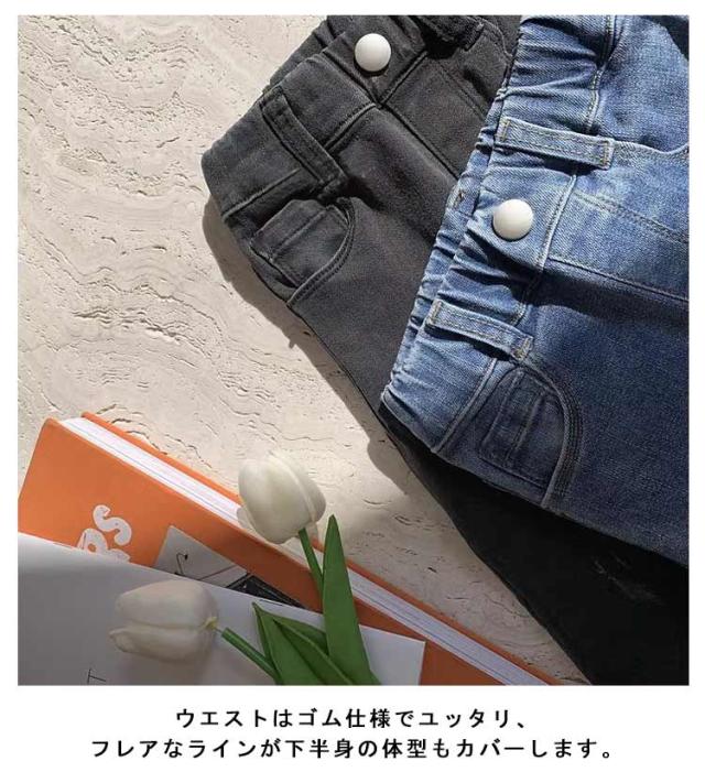| 着回し力抜群のデニムパンツ! ウエストはゴム仕様でユッタリ、フレアなラインが下半身の体型もカバーします。 大人カジュアルに着こなせる、少しゆったりとしたシルエットがポイント。 ハイウエストのデニムパンツは、これからの天気に大活躍の一枚です。 | |