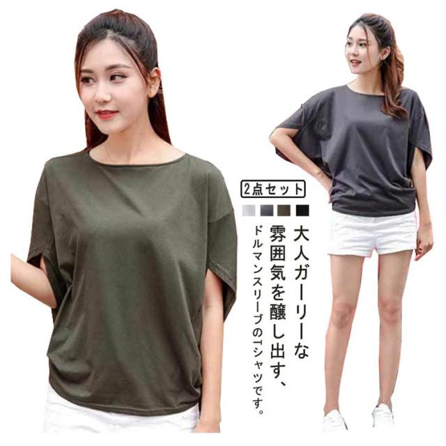 ドルマンスリーブ tシャツ レディース 半袖 Tシャツ 2点セット 無地tシャツ 夏 カットソー ティーシャツ 半袖 トップス カジュアル 大きいサイズ シンプル M L XL 2XL 3XL