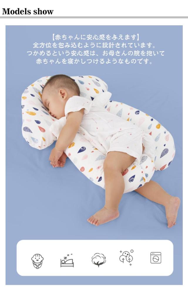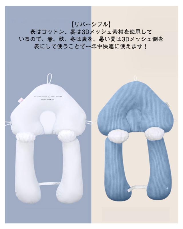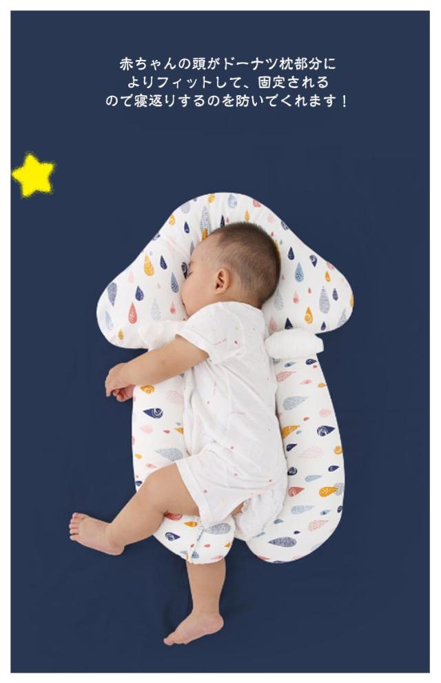 | 【向き癖防止枕】【新生児から使える】【寝返り防止】 【頭の形をやさしく矯正】 やわらかい赤ちゃんの頭を全方向からやさしく包み込み、丸みのあるきれいな形を保ちます。 ねんね期の赤ちゃんには、向き癖・絶壁を防止する。 赤ちゃんの頭がドーナツ枕部分によりフィットして、固定されるので寝返りするのを防いでくれます! 【赤ちゃんに安心感を与えます】 全方位を包み込むように設計されています。 つかめるという安心感は、お母さんの腕を抱いて赤ちゃんを寝かしつけるようなものです。 新生児から使える抜群の寝心地と寝返り防止のお役立ちアイテム☆ 【リバーシブル】 表はコットン、裏は3Dメッシュ素材を使用しているので、春、秋、冬は表を、暑い夏は3Dメッシュ側を表にして使うことで一年中快適に使えます! 寝る時はもちろん、ベビーカーやチャイルドシート、バウンサーやベビーチェアなど色々なシーンで使えてとっても便利! 【本体は丸洗いできて便利】 汚れやすいベビー用品は、丸洗いできるものがとても便利です。 | |
