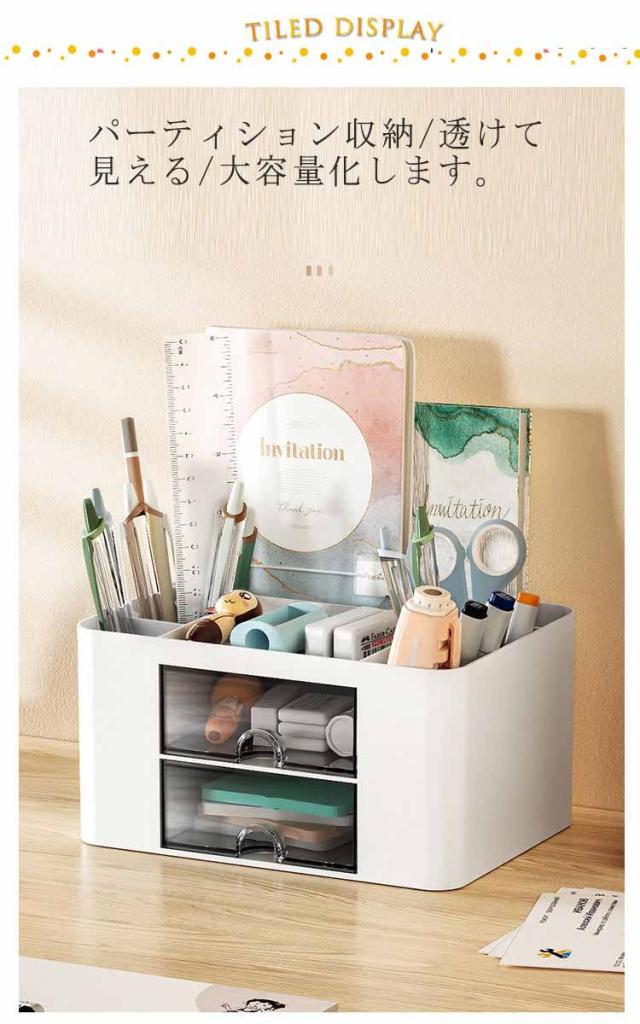 | おしゃれな卓上収納ボックスです。 パーティション収納/透けて見える/大容量化します。 6大パーティション設計で、物を分けて出し入れしやすくなっています。 引き出しタイプだから、滑らかで出し入れしやすく、防?衛生的です。 見た目以上の収納力で文房具や化粧品などを収納して、散らかったデスクをすっきり整えます。 一体型収納ボックス、角がなめらかで傷を防ぐ。 見ればわかるように上品で良い質感の為、周りの環境に自然に溶け込む。品質にこだわり、細部間でキレイにバリ取りなどを処理し、使うとき、手触り良くスムーズに使えます。 | |