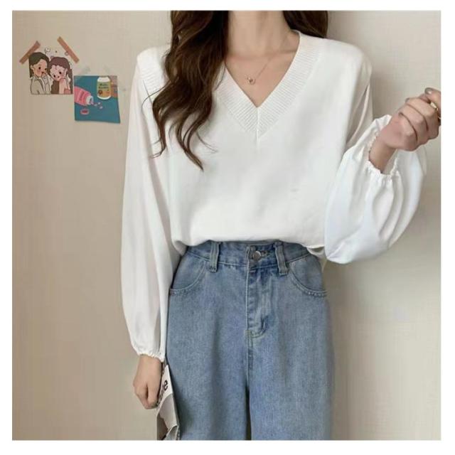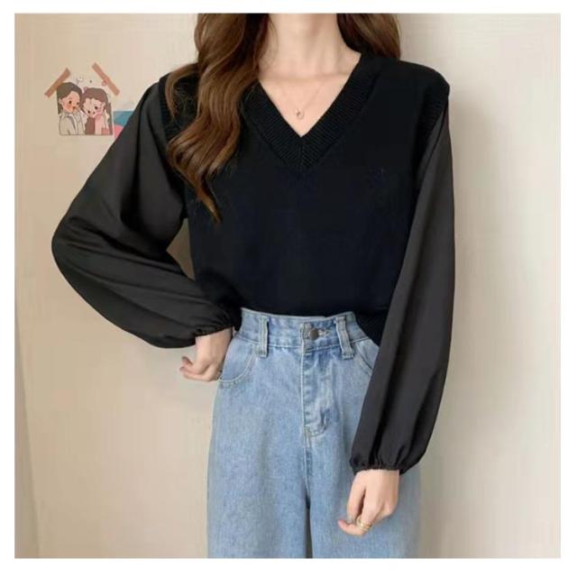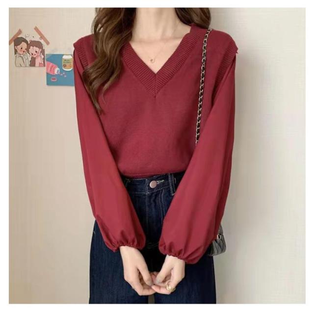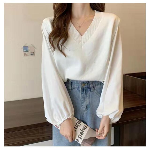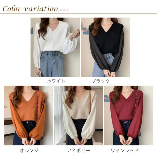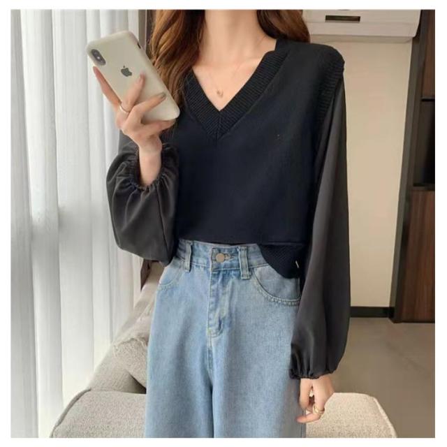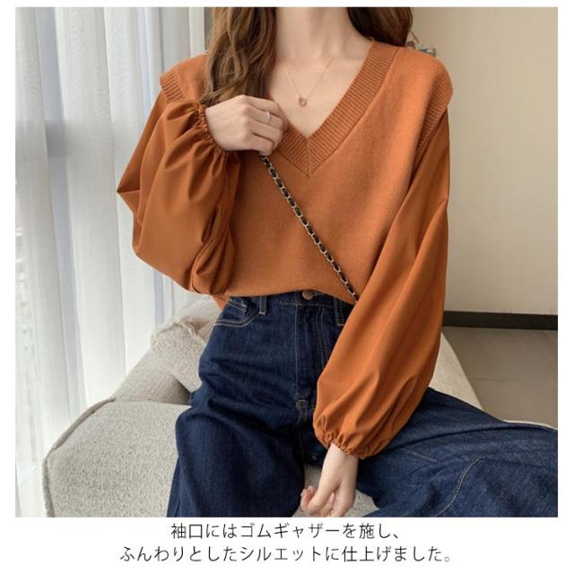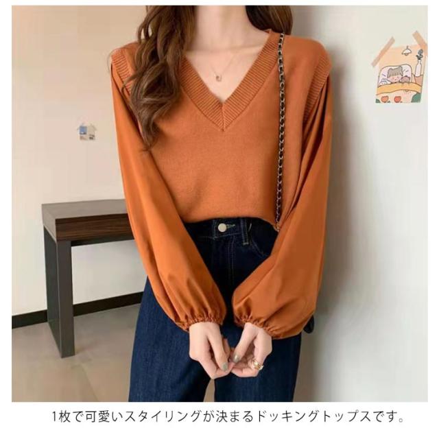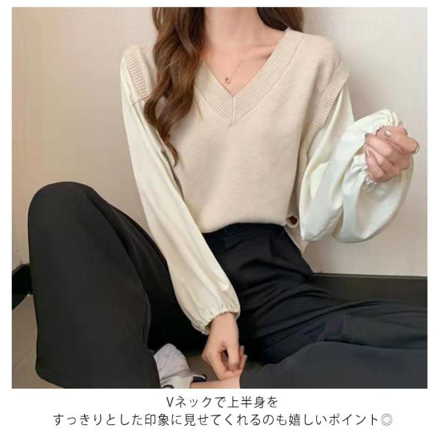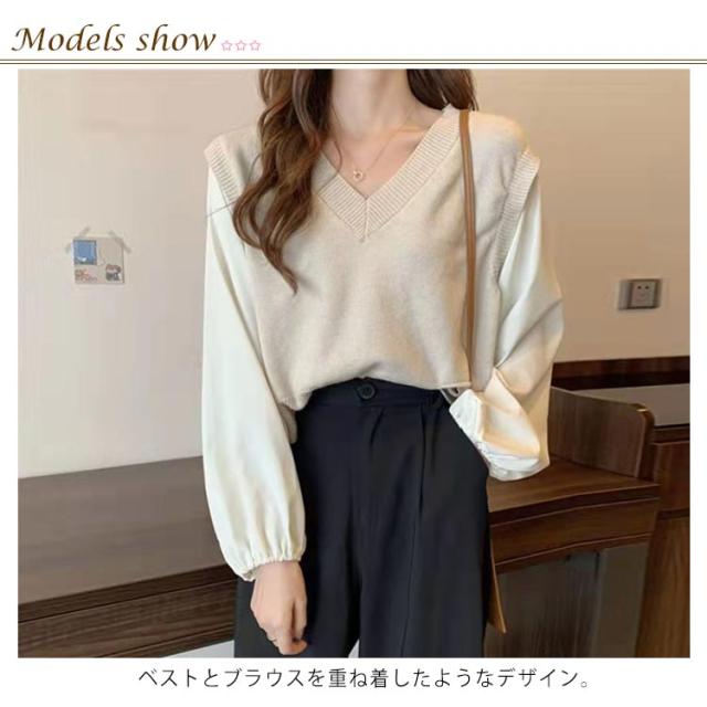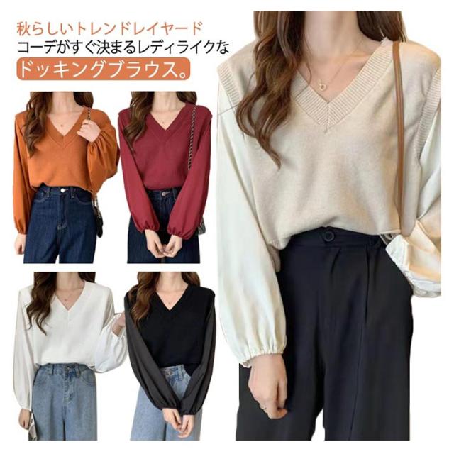 ブラウス 長袖 レディース 春 秋 ドッキング ブラウス Vネック ニットベスト シャツ ボリュームスリーブ レイヤード風 重ね着風 トップス ぽわん袖 20代 30代 40代 50代 通勤 きれいめ おしゃれ 韓国 ファッション シンプル 無地 【送料無料】