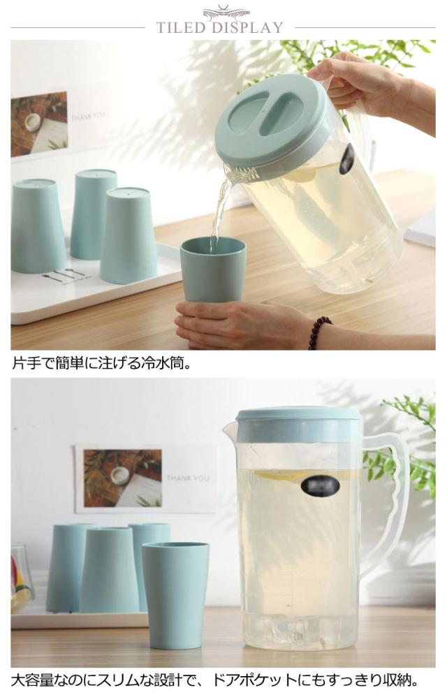 | 2200ml 2600ml 5点組 冷水筒*1+コップ4 片手で簡単に注げる冷水筒 大容量なのにスリムな設計で、ドアポケットにもすっきり収納。 広口タイプで、中まで手を入れてしっかり洗えてお手入れラクラクです。 | |