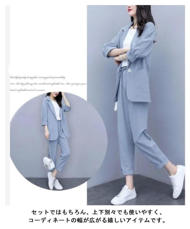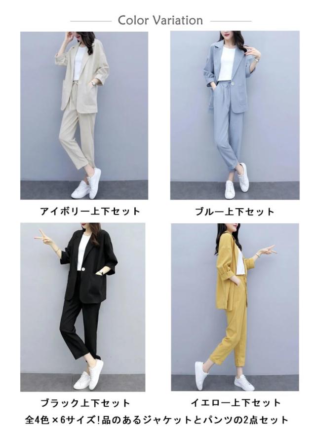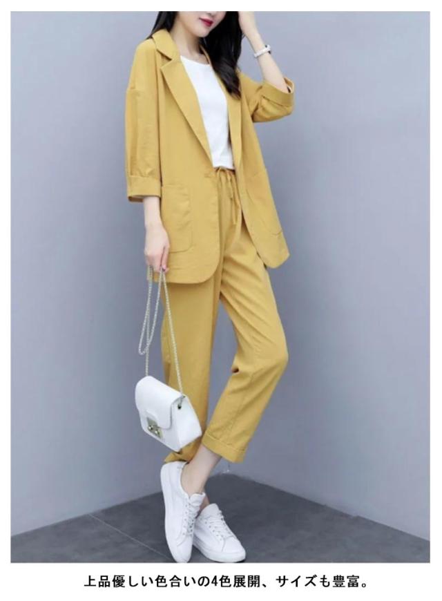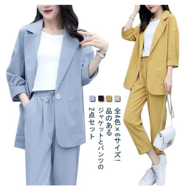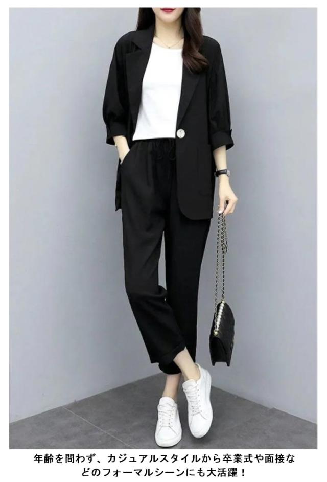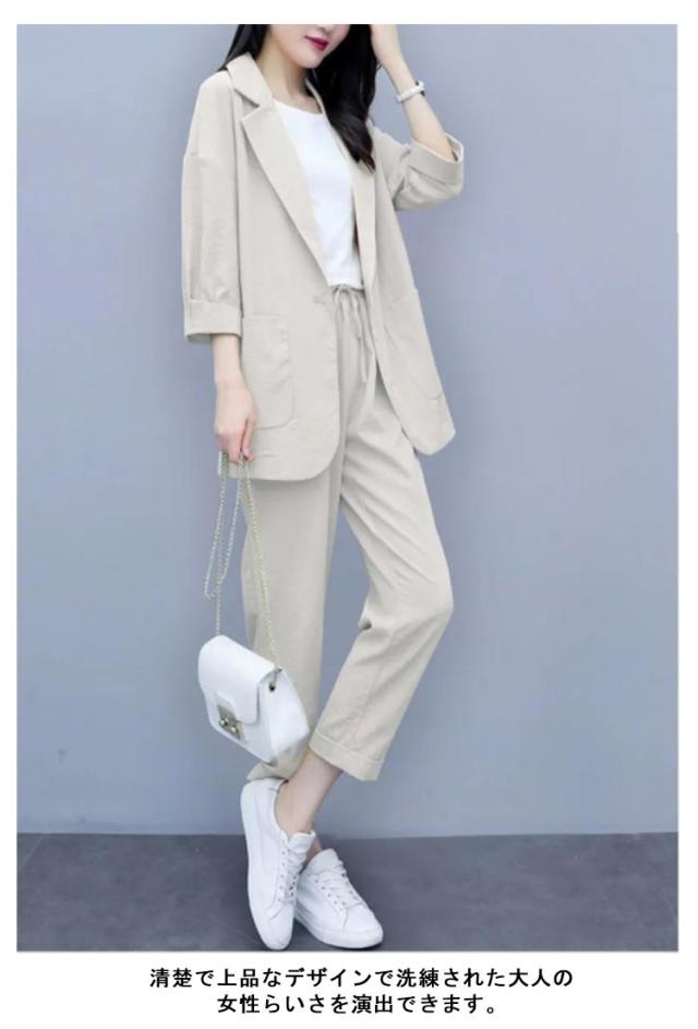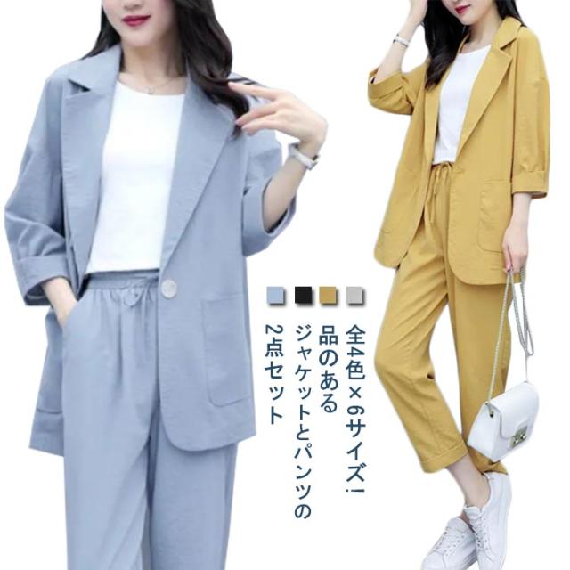 カジュアルスーツ レディース ライトジャケット ズボン セットアップ 上下 2点セット おしゃれ フォーマル OL 通勤 七分袖ジャケット 着?せ 体型カバー 大きいサイズ 無地イージーパンツ 9分丈パンツ 薄手 春秋 夏 キレイめ シンプル おしゃれ ギフト 送料無料