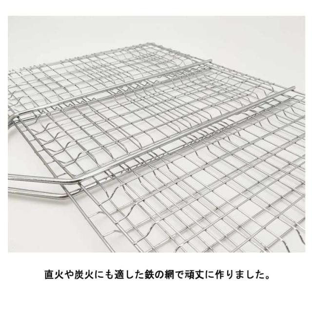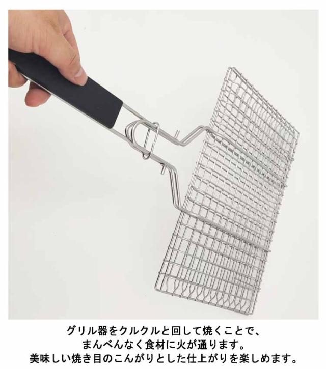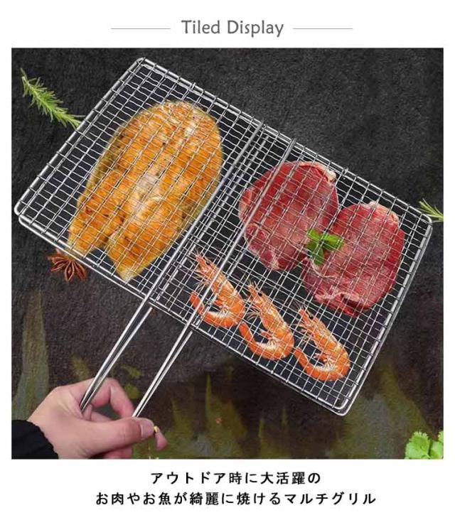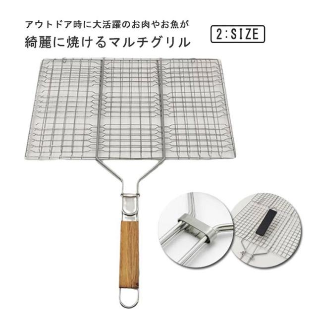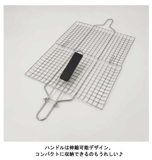 | アウトドア時に大活躍のお肉やお魚が綺麗に焼けるマルチグリル 直火や炭火にも適した鉄の網で頑丈に作りました。 食材を挟んで火にかけられる仕様でお肉や魚の身が崩れず、中まで火が通ります。 グリル器をクルクルと回して焼くことで、まんべんなく食材に火が通ります。 焼き網は肉や魚、焼き鳥をはじめ、様々な調理に使えます。 焼き網を閉じると固定リングがしっかりガードして外れず、ひっくり返しても食材は落ちません。 木製のグリップが付いて手を火傷からしっかりと守ります。 美味しい焼き目のこんがりとした仕上がりを楽しめます。 ハンドルは伸縮可能デザイン、コンパクトに収納できるのもうれしい♪ ワイワイキャンプやレジャーを楽しむおともに! ※脂や焼き汁の多く出る食材を調理される場合はガスコンロでのご使用は避けて下さい。 | |