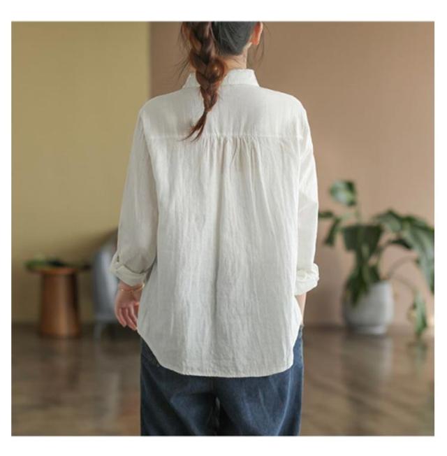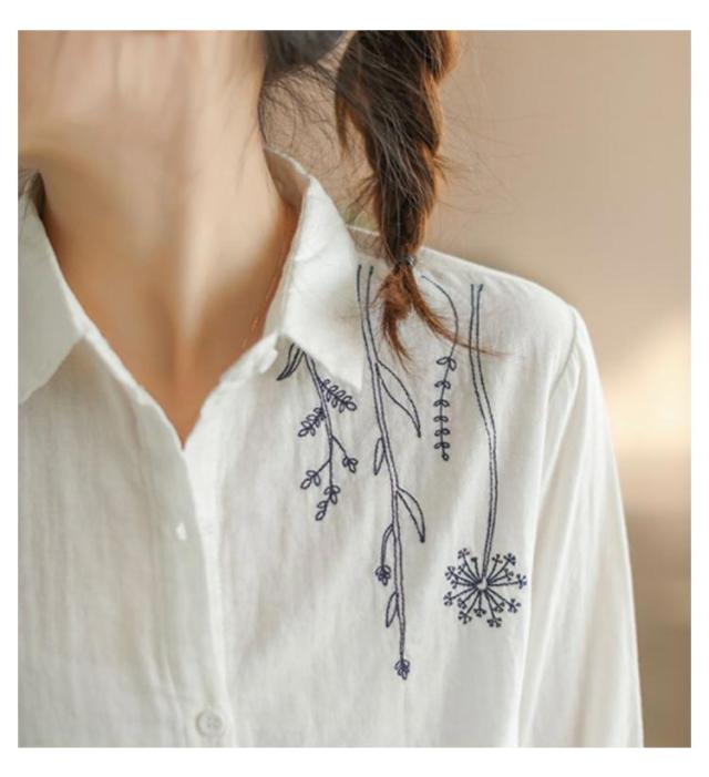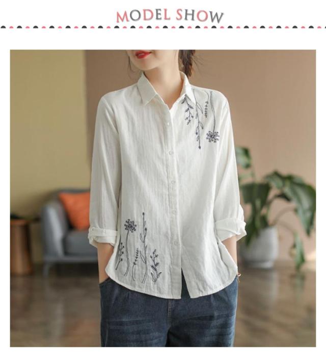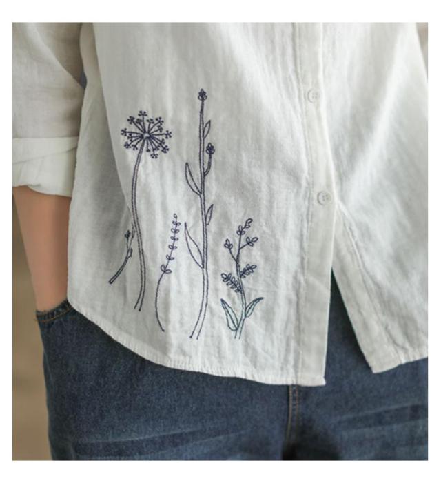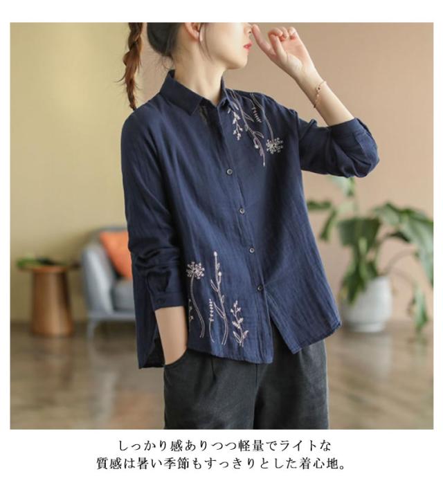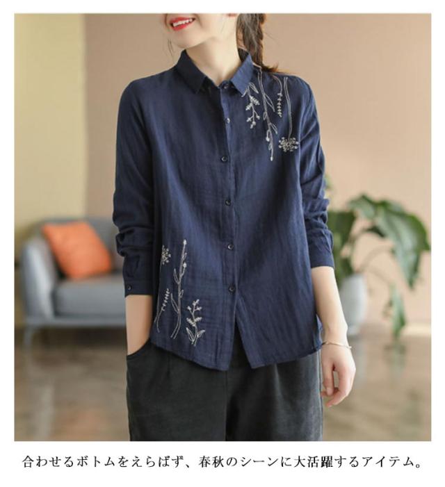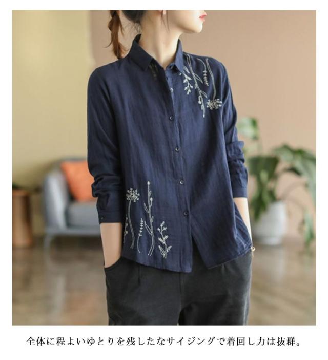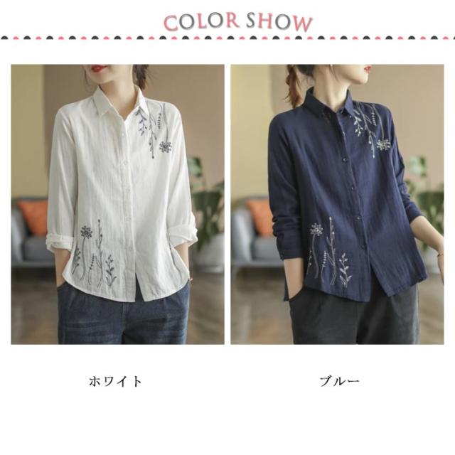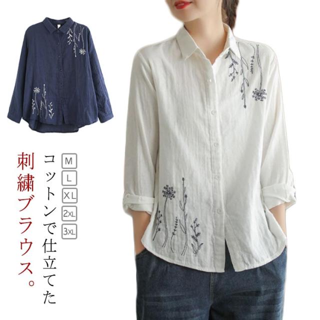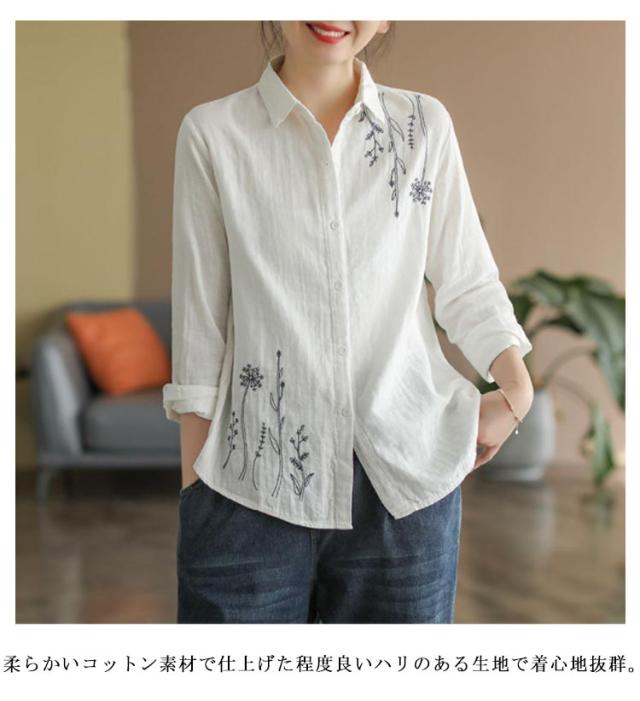 白シャツ レディース シャツブラウス 刺繍 長袖シャツ 花柄 刺繍シャツ 春 秋 冬 ナチュラル 送料無料