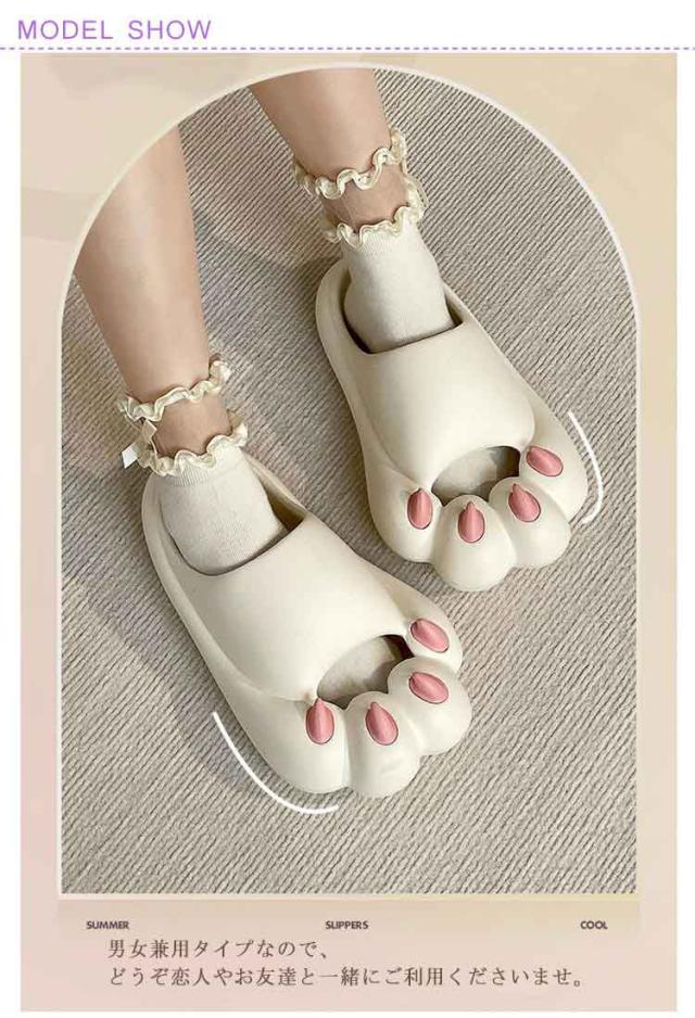 | めちゃくちゃ可愛いねこ足サンダル! 足型にフィットして、柔らかなEVA材質は高い弾性と柔軟性で快適で摩耗に強くて、足部の圧力を緩和します、長く履いても足が蒸れません かわいいキャラクターの猫足の靴先で、つま先を完全に包み、足の指を守ります 滑りにくいテクスチャデザインで地面にしっかりしがみついて安心できます。 クッション性良いEVA素材を使用しているので、長時間に履いても疲れにくくて使いやすい。 ルームスリッパとしてはもちろん、お出かけでも使えます。 男女兼用タイプなので、どうぞ恋人やお友達と一緒にご利用くださいませ。 | |