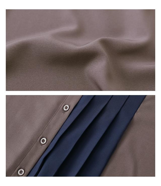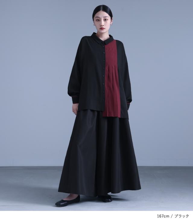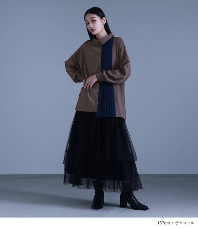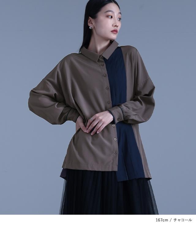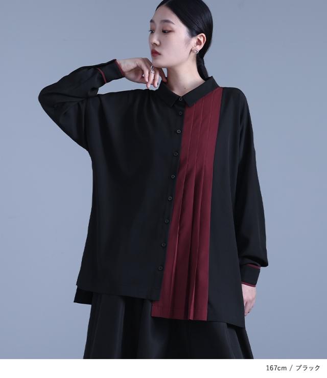 『配色切替プリーツデザインシャツ』 ※メール便可※【10】[シャツ レディース トップス ブラウス 襟付き 長袖 アシンメトリー]※メール便可※