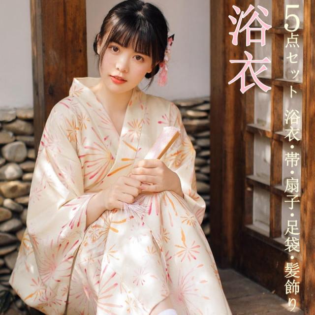 ・淡くやわらかな色合いで女性らしさをより引き立ててくれる1着。・華やかな花火の柄で大人可愛く上品な印象です。・柔らかい風合いの生地で、快適な軽々の着心地です。・夏のお祭り、花火大会、イベント衣装としておすすめです。・浴衣、帯(約115cm)、たび、扇子、帯締め、髪飾りのお得な5点セットです。 (帯留め、肌襦袢、帯揚げやチュール素材兵児帯などは撮影用小物であり、付属しません) (付属の「帯、帯締め、足袋、扇子、髪飾り」はランダムで、指定が出来かねます)