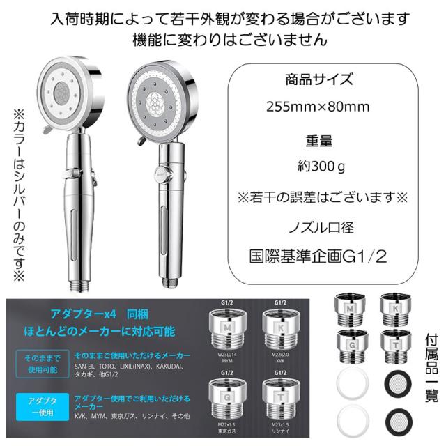 シャワーヘッドはM/K/G/Tの4種類のアダプターを付き、