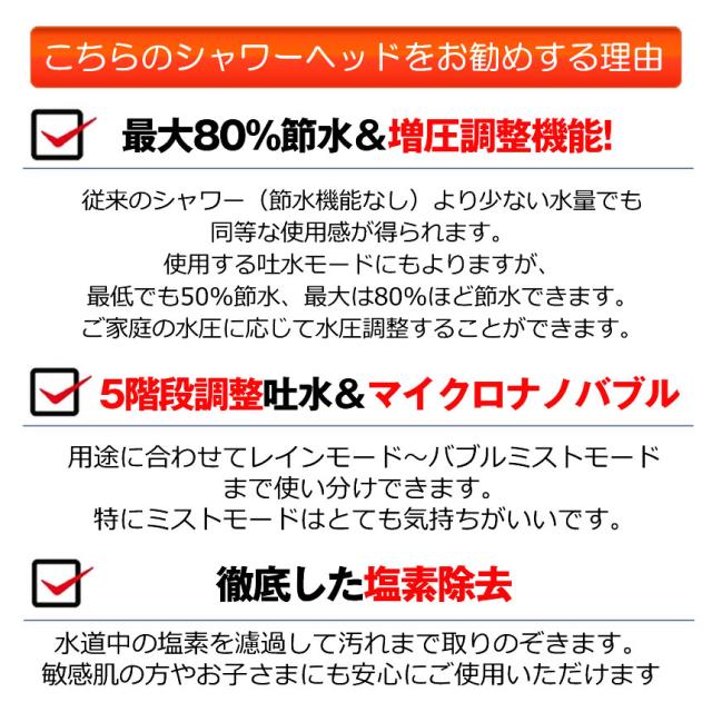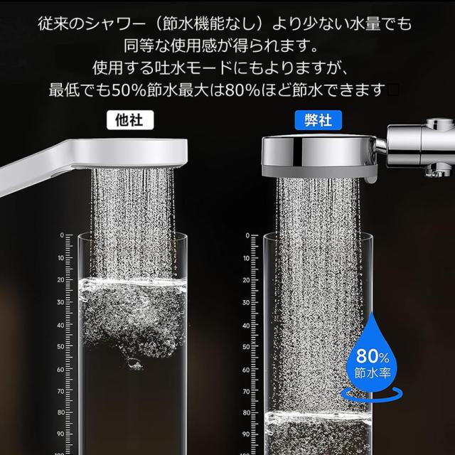 シャワーの勢いが増し、最大 80% の水を節約できます。市販のシャワーと比べて、水道代やガス代を年間約3万円節約できます。