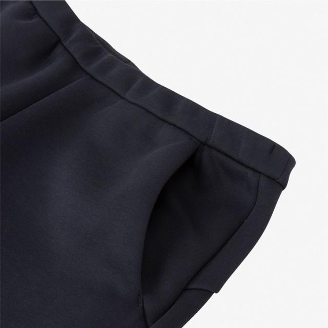 すっきりとしたテーパードシルエットで、膝裏にはダーツを設けて動きやすさを考慮。