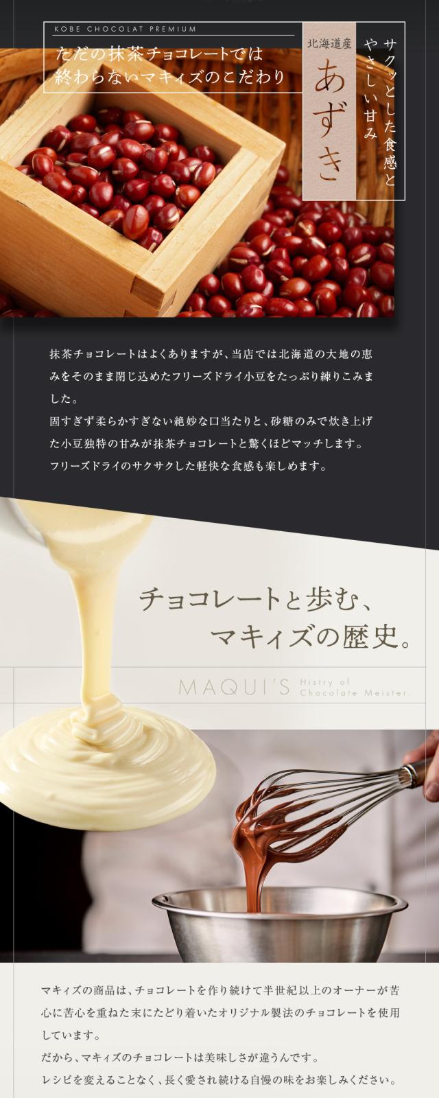 チョコレート(国内製造)、乾燥小豆(小豆、砂糖)、ココアバター、抹茶/乳化剤、香料、(一部に乳成分・大豆を含む)
