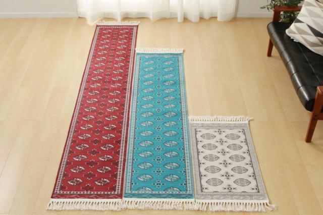 トルクメン絨毯とは、イラン北東部にすむトルコ系の遊牧民、トルクメン族によって昔から織り継がれている絨毯です。 細かく丁寧な織り目としなやかで薄手に仕上げられるトルクメン絨毯は部族系ペルシャ絨毯の中でも細かな織りを誇り、 正確なモチーフとシンプルな色遣いが垢抜けた印象を与えてくれます。 そのトルクメンの風合いをプリントで繊細に再現しました! 丸洗いできるから、キッチンなどの汚れやすい場所でも安心してお使いいただけます。 裏面にはすべり止めが付いているので、ズレにくいのも嬉しいポイントです。 |