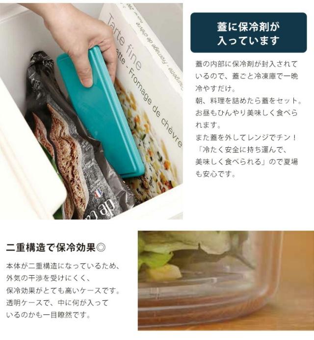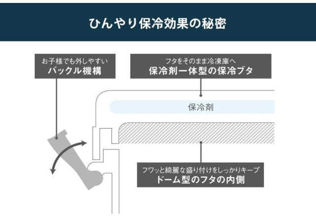 | 素材 | (本体・仕切り):ポリプロピレン (耐熱温度/耐冷温度:140/-20℃) (保冷ブタ):ABS樹脂 (耐熱温度/耐冷温度:60℃/-20℃) (中蓋):SEBS樹脂 (耐熱温度/耐冷温度:120℃/-60℃) (ゴムバンド):レーヨン・ポリエステル・ラバー |
