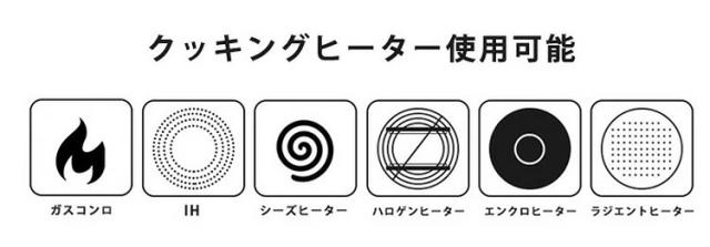 | 使用可能ヒーター | ガスコンロ/IH/シーズヒーター/ハロゲンヒーター/ エンクロヒーター/ラジエントヒーター |