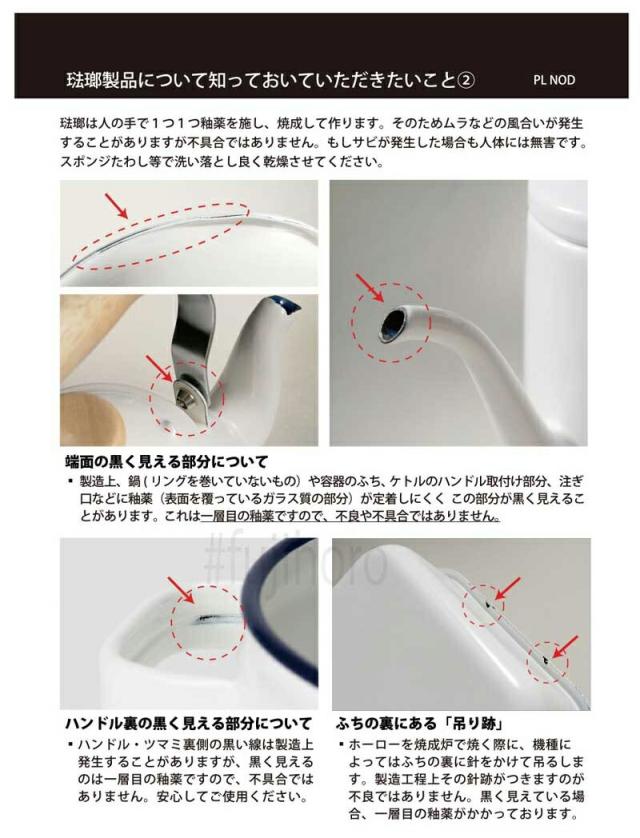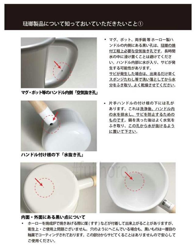 | ※ご注意 | ・ ホーロー製品は手作業で釉薬をかけておりますので、多少の個体差がございます。鍋本体や蓋に黒点や塗りムラが見られる場合がありますが、