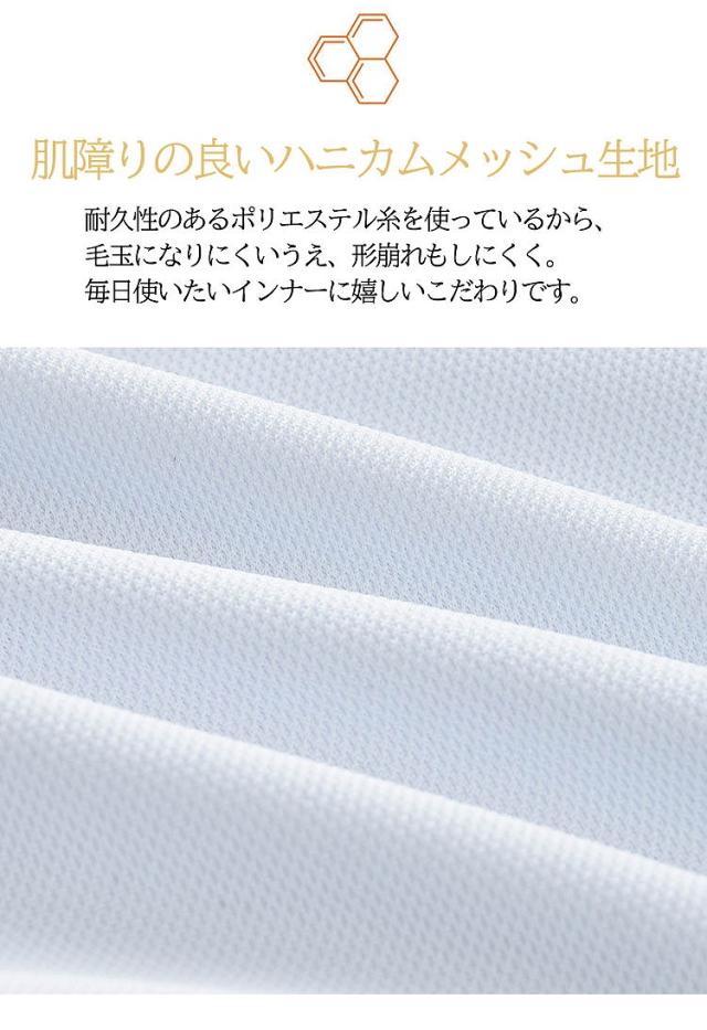 薄手のポリエステル生地はハニカムメッシュ仕立て。ハニカムメッシュは表面に凹凸を出し、小さな網状の構造の素材なので、肌にへばりつきにくく、通気性にも優れています。