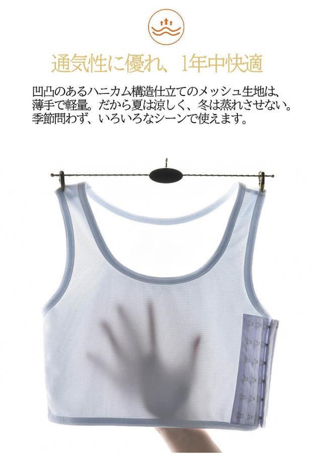 | 商品の説明 | ぎゅっと引き締めて、大きな胸は小さく、小さな胸は平らに整えてくれる胸つぶしインナー。 体にフィットするインナーは、着脱が面倒なものですが、脇で止めるホックタイプだから、着替えがとてもスムーズ。 ホックは3段式だから、好みに合わせて微調整も可能です。 薄手のポリエステル生地はハニカムメッシュ仕立て。ハニカムメッシュは表面に凹凸を出し、小さな網状の構造の素材なので、肌にへばりつきにくく、通気性にも優れています。 暑い夏は涼しく、寒い冬は重ね着しても蒸れにくいので、1年を通してお使いいただけます。 着るだけでしっかりぺた胸が叶うので、大きな胸を気にしている方、和装用の補正下着としての使用はもちろん、男装やハロウィンのコスプレやFtMの方にも愛用いただけます。 |