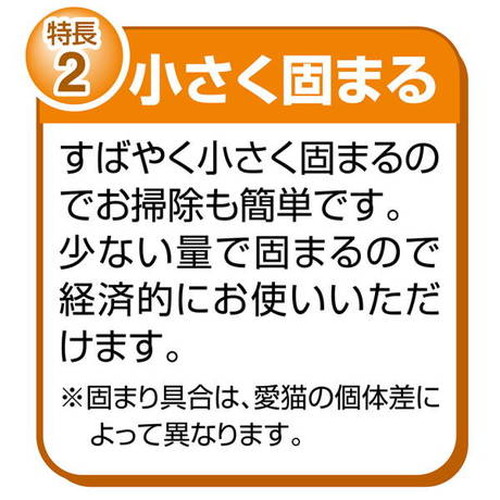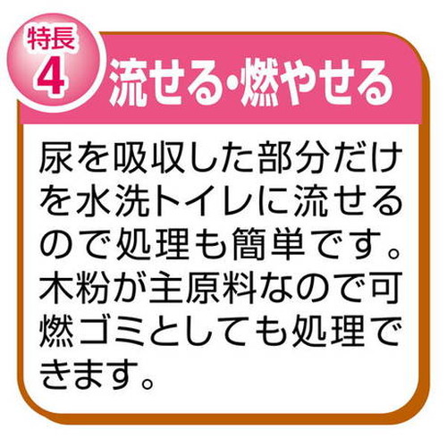 すばやく小さく固まり、水洗トイレに流せるので処理も簡単です。リサイクル材の木粉が主原料なので、環境にも優しくフィトンチッドにより消臭効果もあります。可燃ゴミとしても処理できます。ベントナイト(粘土鉱物)は一切使用していません。1袋でオシッコ約200回分使用可能(1回のオシッコ量20ccの場合)。