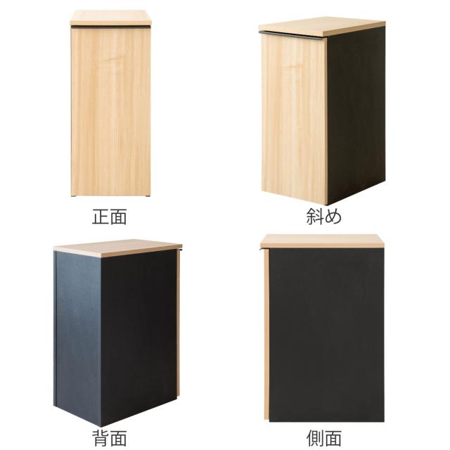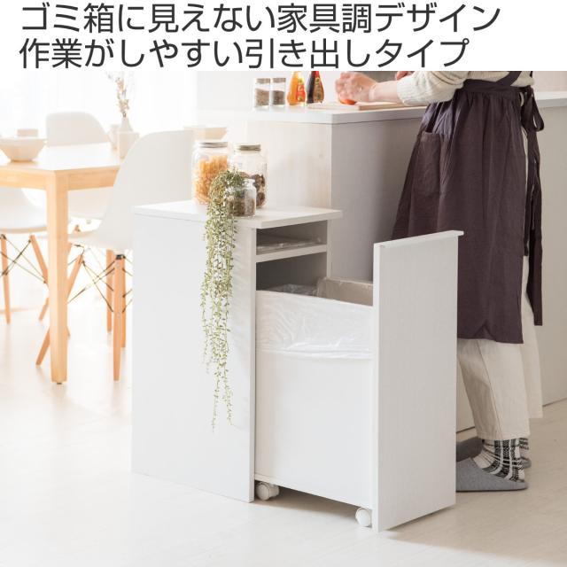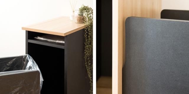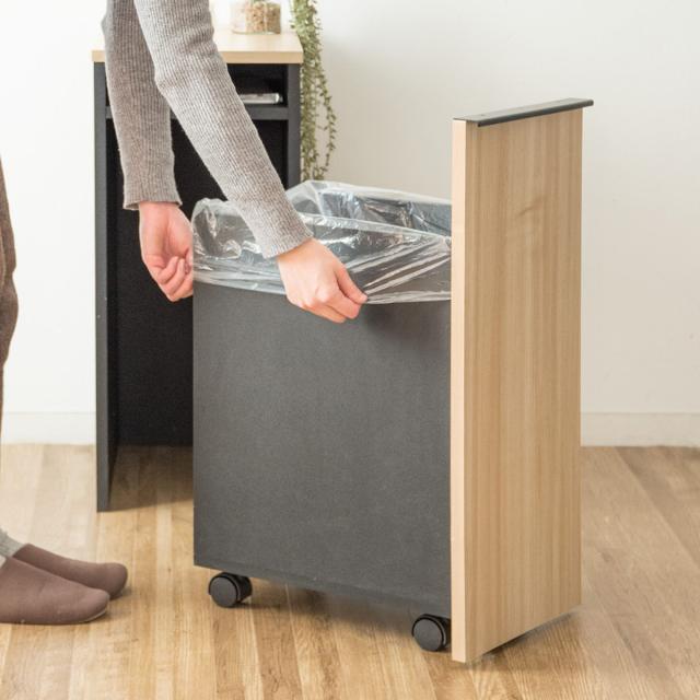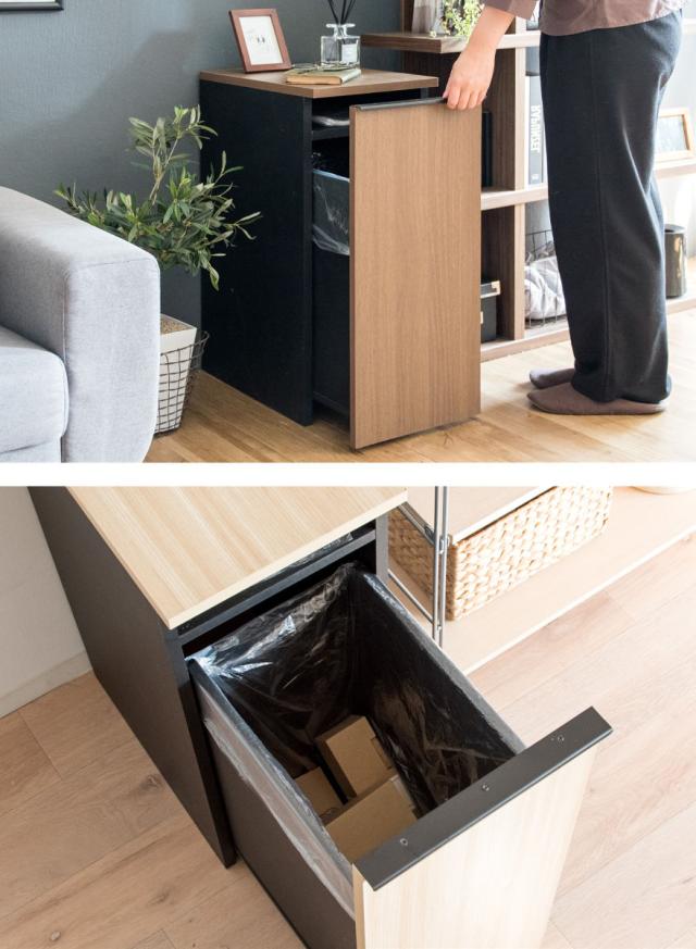 一般的な樹脂製のゴミ箱は天面にふたがあり、その場合ゴミ箱の上がデッドスペースになってしまいますが、引き出し式のゴミ箱なのでキッチン家電や小物が置けてスぺースを有効活用できます。また、素材は撥水・耐久性にも優れた合成樹脂化粧繊維板を使用している為、汚れたり水に濡れてもサッとひと拭きでキレイを保つことができます。