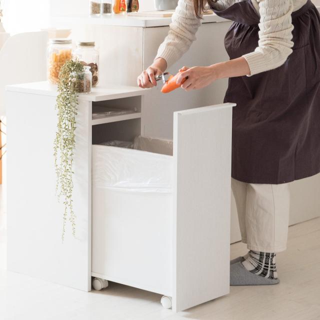 ゴミ箱は移動可能なキャスター付きなので直接捨てたい物は手元まで引き寄せてサッと捨てることができます。料理中に出る生ゴミなどを捨てる際にも便利です。