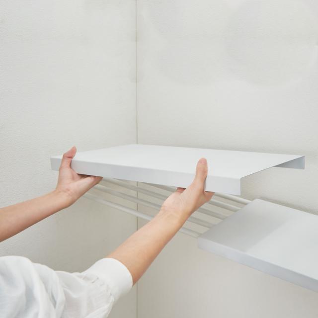 対応する突っ張り棒や突っ張り棚に被せるだけでスタイリッシュなスチール棚が完成します。ランドリールームの洗剤はもちろん小物も安定してすっきり収納ができます。