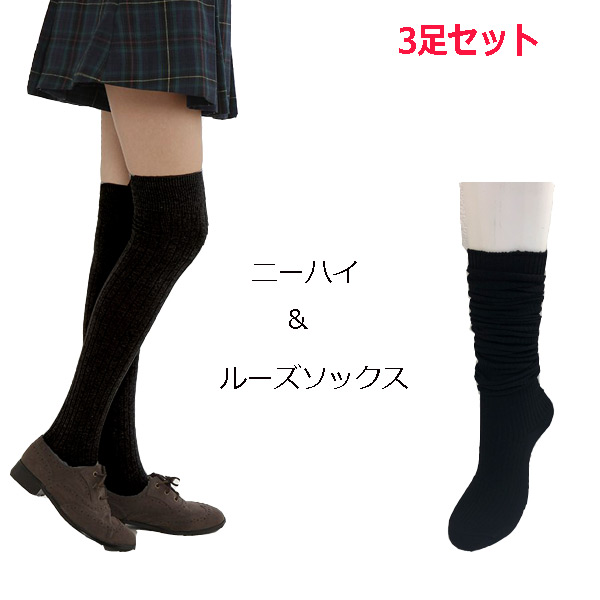 ニーハイソックス 黒 【3足セット】 ルーズソックス としても 丈夫 破れにくい 美脚ソックス ひざ上丈 綿混 無地 オーバーニー レディース靴下