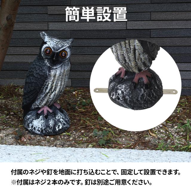 ふくろうの前を通ることで足元に付いている人感センサーが反応し動物が嫌がる鳴き声を出します。