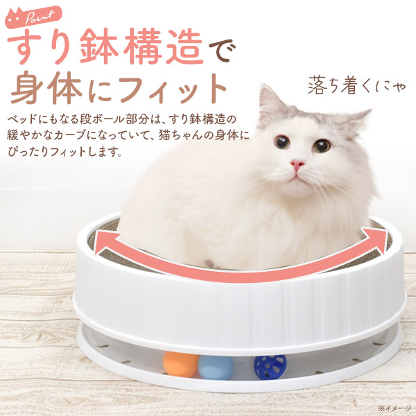 ホワイトカラーでインテリアに馴染みやすいデザインです。 渦巻き状になった高密度の段ボールの爪とぎになっていて、 中心部分が凹んでいるので、削りカスが飛び散りにくくなっています。 すり鉢構造の緩やかなカーブが、猫ちゃんの身体にぴったりフィット! ベッドの隙間には猫ちゃんの興味を誘うコロコロと転がるボールが入っています。 ベッドのパーツごとに取り外すことができ、掃除がしやすく、いつでも清潔に保つことができます。 段ボールの爪とぎも取り外して付け替えることができます。 | ||||||||||