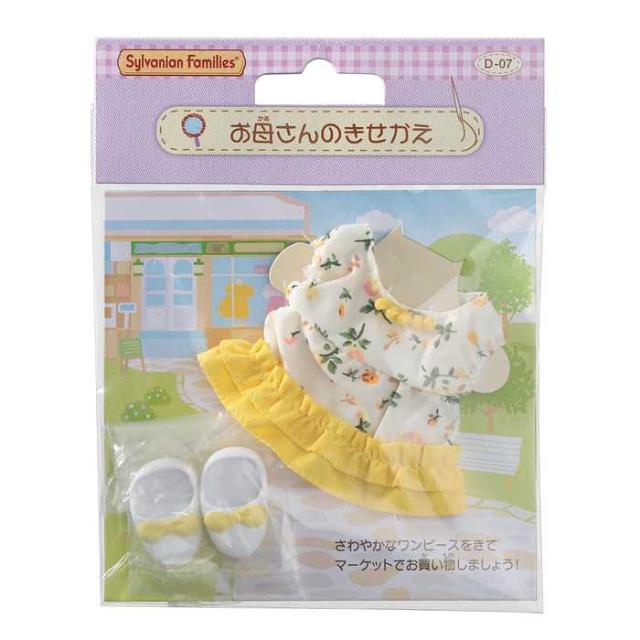 お母さん用のきせかえです。おしゃれなワンピースは、きいろいフリルがポイント。お買い物がますますたのしくなりそう♪