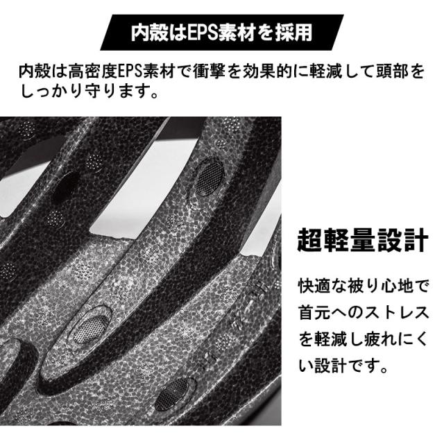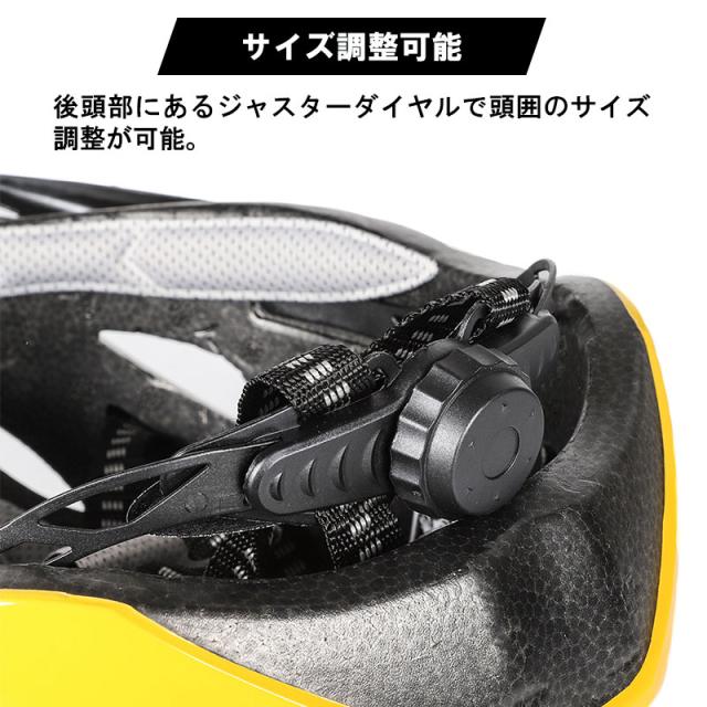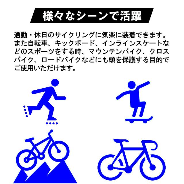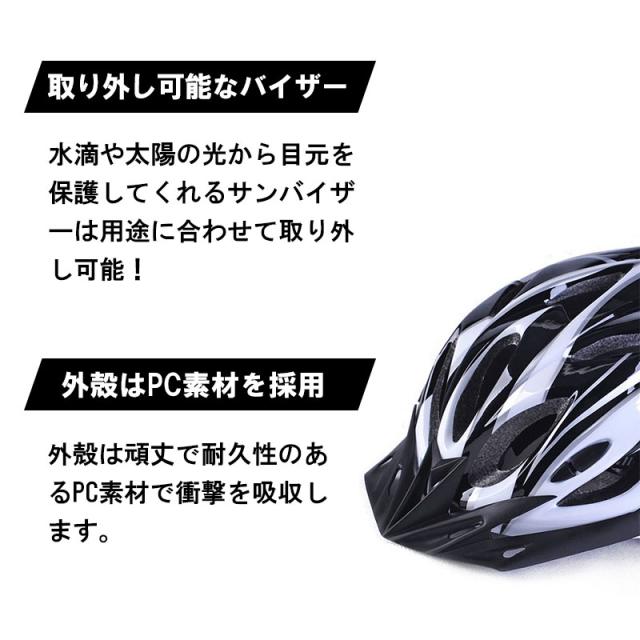 スポーティーな自転車用ヘルメットです。このヘルメットは安全性を確保した上に、ファッションも考えたデザイン!通勤や通学、サイクリングなど様々なシチュエーションにマッチするスタイリッシュなデザインです。外殻は頑丈で耐久性のあるPC素材で衝撃を吸収します。内殻は高密度EPS素材で衝撃を効果的に軽減して頭部をしっかり守ります。超軽量設計、快適な被り心地で首元へのストレスを軽減し疲れにくい設計です。通気孔付きでヘルメット内部の空気の流れを向上させ、様々な角度から風を通してムレにくく、快適な付け心地となっております。水滴や太陽の光から目元を保護してくれるサンバイザーは用途に合わせて取り外し可能!また、内側のインナークッションは取り外して洗えるので清潔!いつでも快適にお使い頂けます。後頭部にあるジャスターダイヤルで頭囲のサイズ調整が可能♪