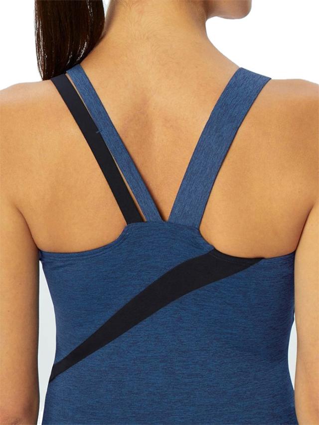 トップスはディアゴナル(対角線)デザインでシャープな印象。アシンメトリーな肩ストラップ(スプリットストラップとフラットストラップ)は、接着仕様で縫製をなくし、肌当たりのストレスを軽減。ストラップの形状保持機能も実感できます。
