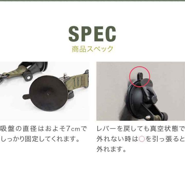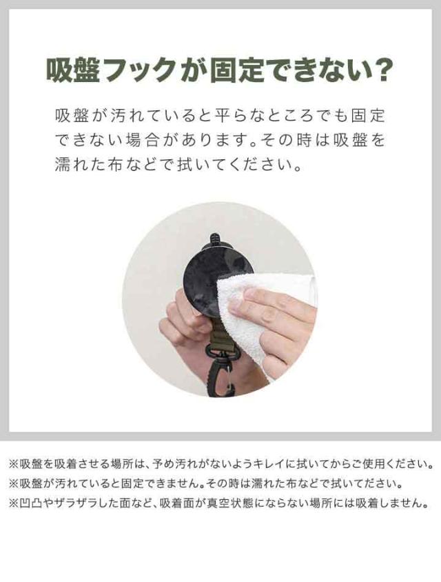 | 特記事項: ※吸盤を吸着させるところは、予め汚れがないようにキレイに拭いてからご使用ください。 ※吸盤が汚れていると固定できないので、その時は濡れた布などで拭いてご使用ください。 ※凹凸のある面やザラザラとした面など、吸着面が真空状態にならない場所には吸着しません。 |