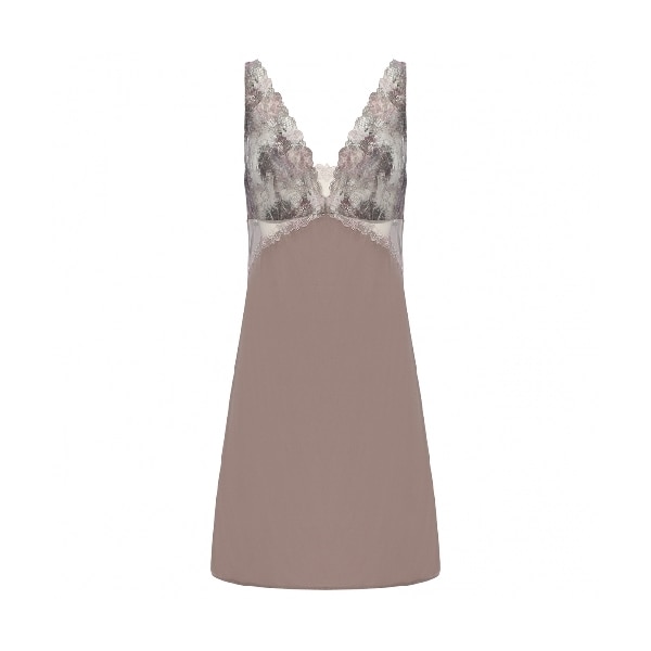 モダンアート風にくずしたヴィクトリアン調の花柄で、スペシャルな日のときめきを表現。繊細なプリントカラーに合わせた胸元の刺繍レースが華やかなデザインです。