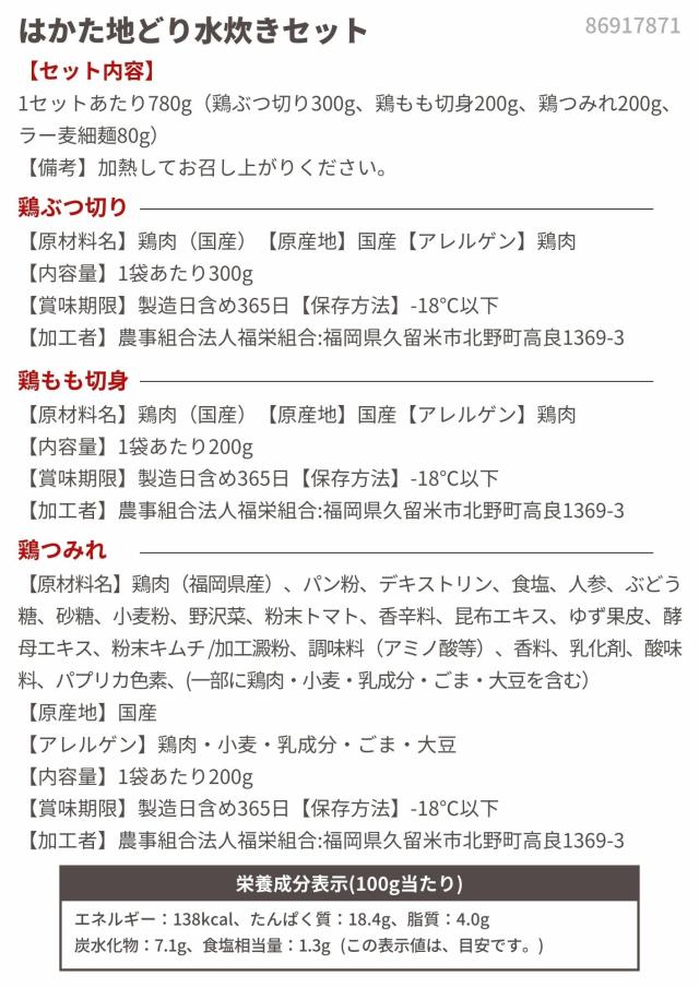 【内容量】1セットあたり780g(鶏ぶつ切り300g、鶏もも切り身200g、鶏つみれ200g、干しめん80g)