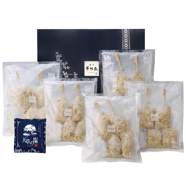 ■商品詳細:華味鳥 もも串 30g×4、つくね串 30g×4、梅しそ巻串 30g×4、鳥ごぼうコロッケ串 30g×4、ささみクリームチーズ串 50g×4、天草の塩 50g×1