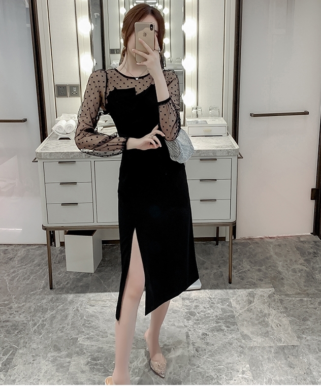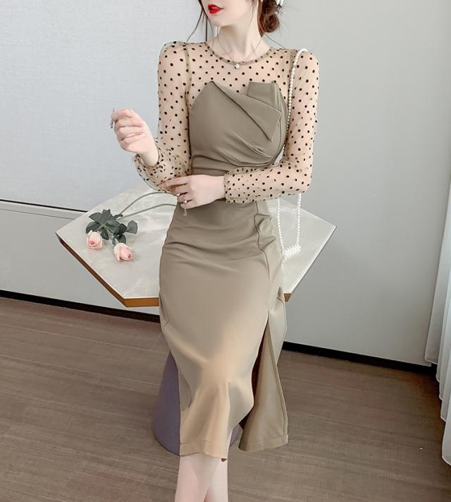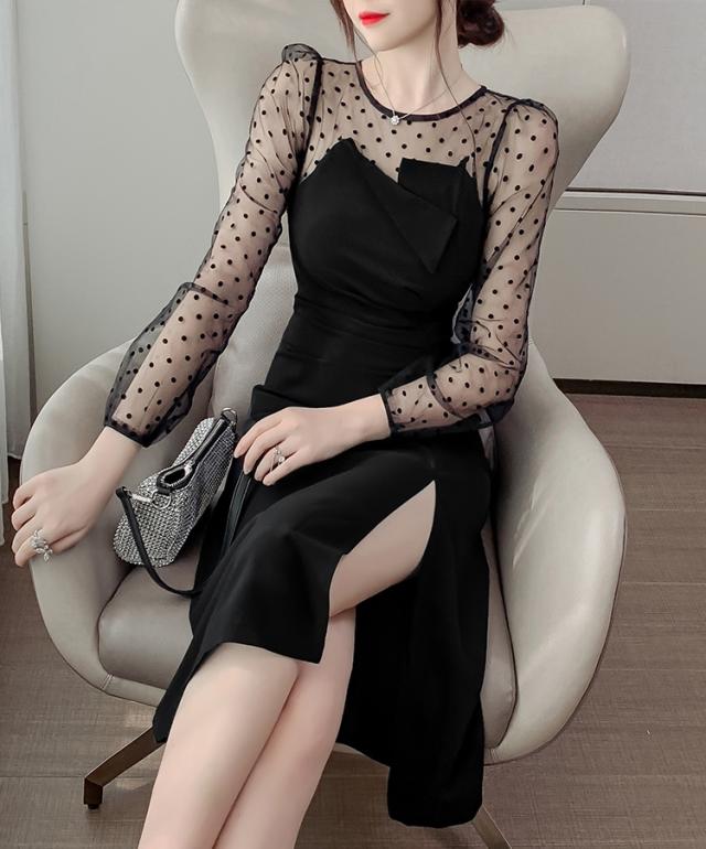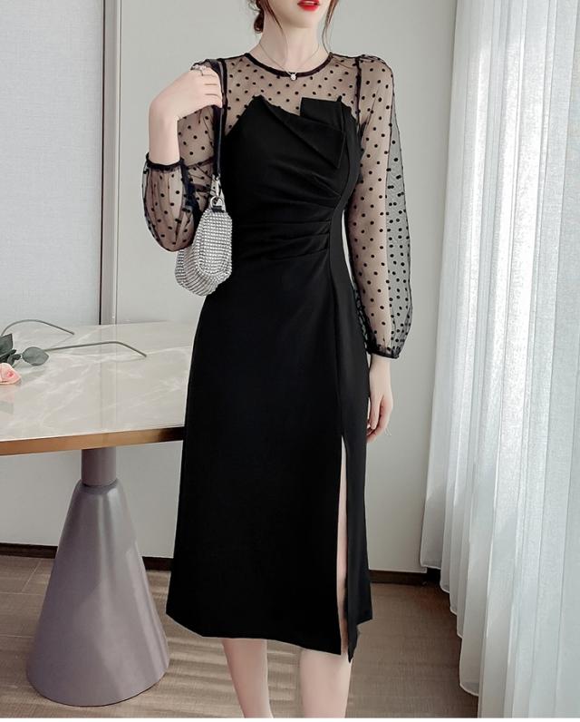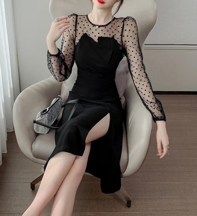 【2色】ドット ワンピース ドレス シースルー スリット パーティードレス 二次会ドレス 膝下 袖あり 七分袖 ラウンドネック 襟なし Iライン スレンダーライン ポリエステルエレガント きれいめ華やか サイズ S M L XL ブラック ベージュ ウェディング ブライダル 結婚式 二次会 1.5次会 10代 20代 30代 レディース イベント 送料無料
