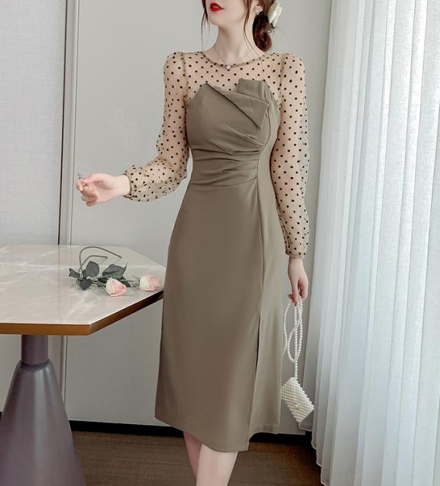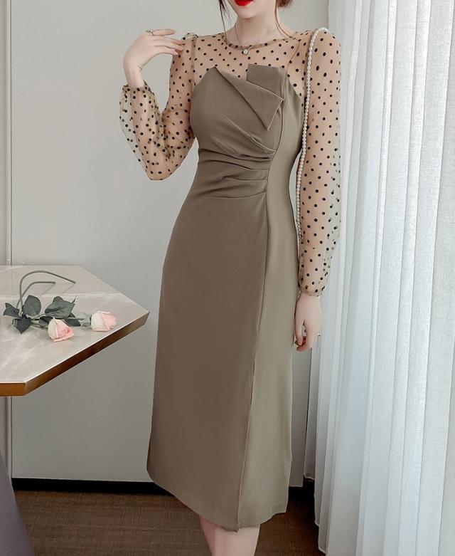 【2色】ドット ワンピース ドレス シースルー スリット パーティードレス 二次会ドレス 膝下 袖あり 七分袖 ラウンドネック 襟なし Iライン スレンダーライン ポリエステルエレガント きれいめ華やか サイズ S M L XL ブラック ベージュ ウェディング ブライダル 結婚式